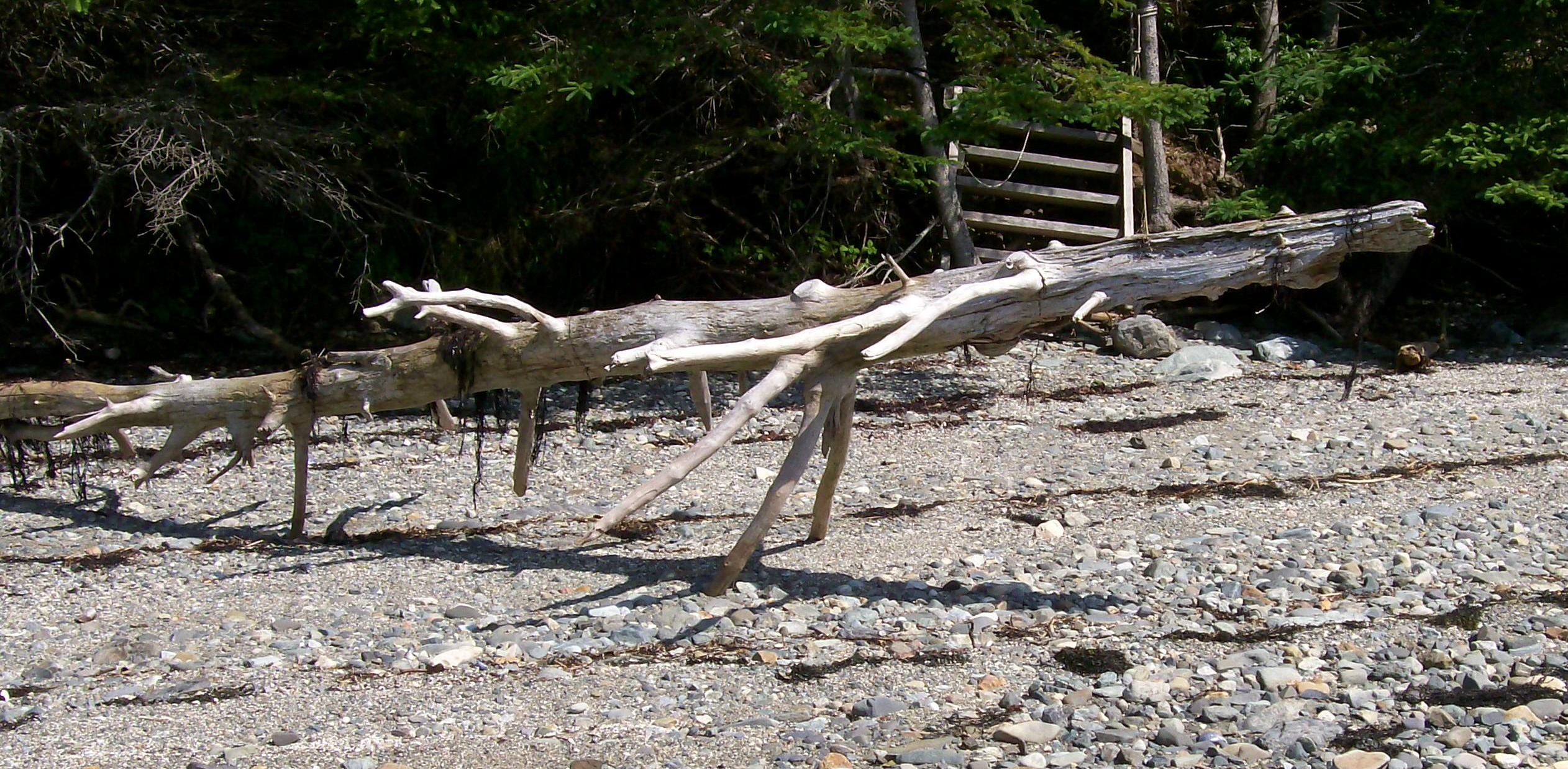 At night the lizard bends his branch-forelegs down and rests. When the high tide comes in, he laps the water. He was carried by it so long it tastes comforting, like home. All day he stands, observing sea, sky and the rock-strewn beach, alert for whatever he was put there to do.