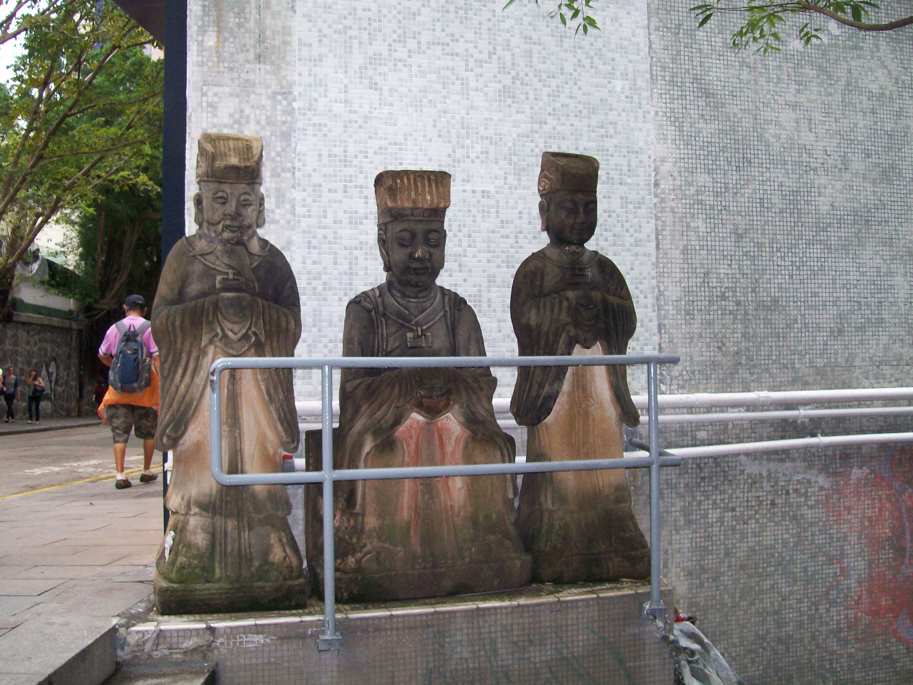 Our hotel was situated on Hollywood Road (named for holly trees, not that other Hollywood) which meant that we often walked past antique shops, doing some serious window shopping. It puzzled me that these figures were on the side of a building which was not selling antiques. Who put them there? I did not find out. They seem to me to be guardians.