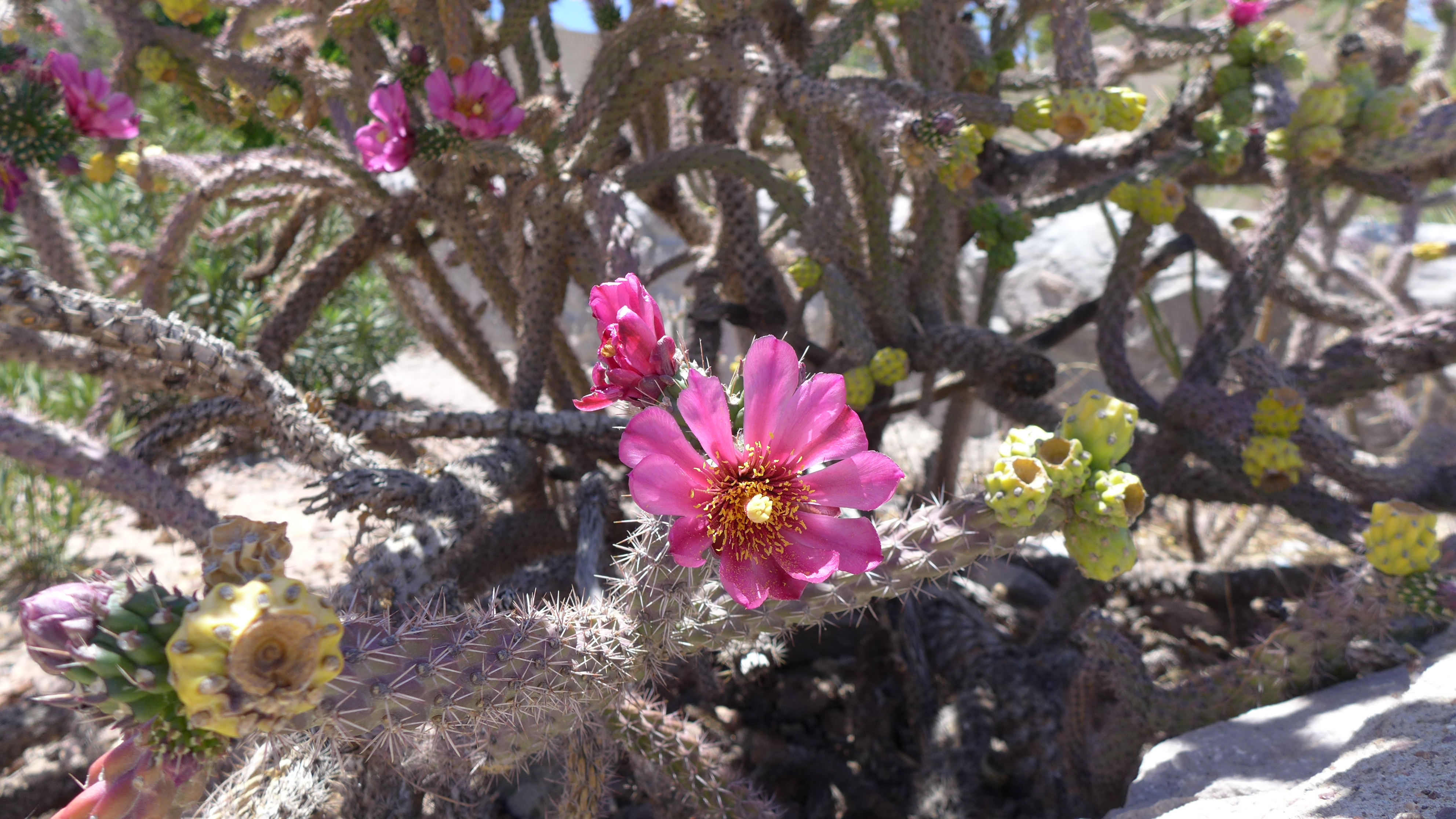 One plant I’ve been wanting for my yard and haven’t found a place for is cholla. It is much better behaved and less weedy than prickly pear, so I may yet find a spot. I love the way the flowers appear among the pods from last year. At some point in my youth I was part of a class in colors, for clothes, in which we were told not to mix purple and yellow. Nature missed this suggestion. I see yellow and purple flowers together every all, and here, the purple flowers among yellow seed pods.