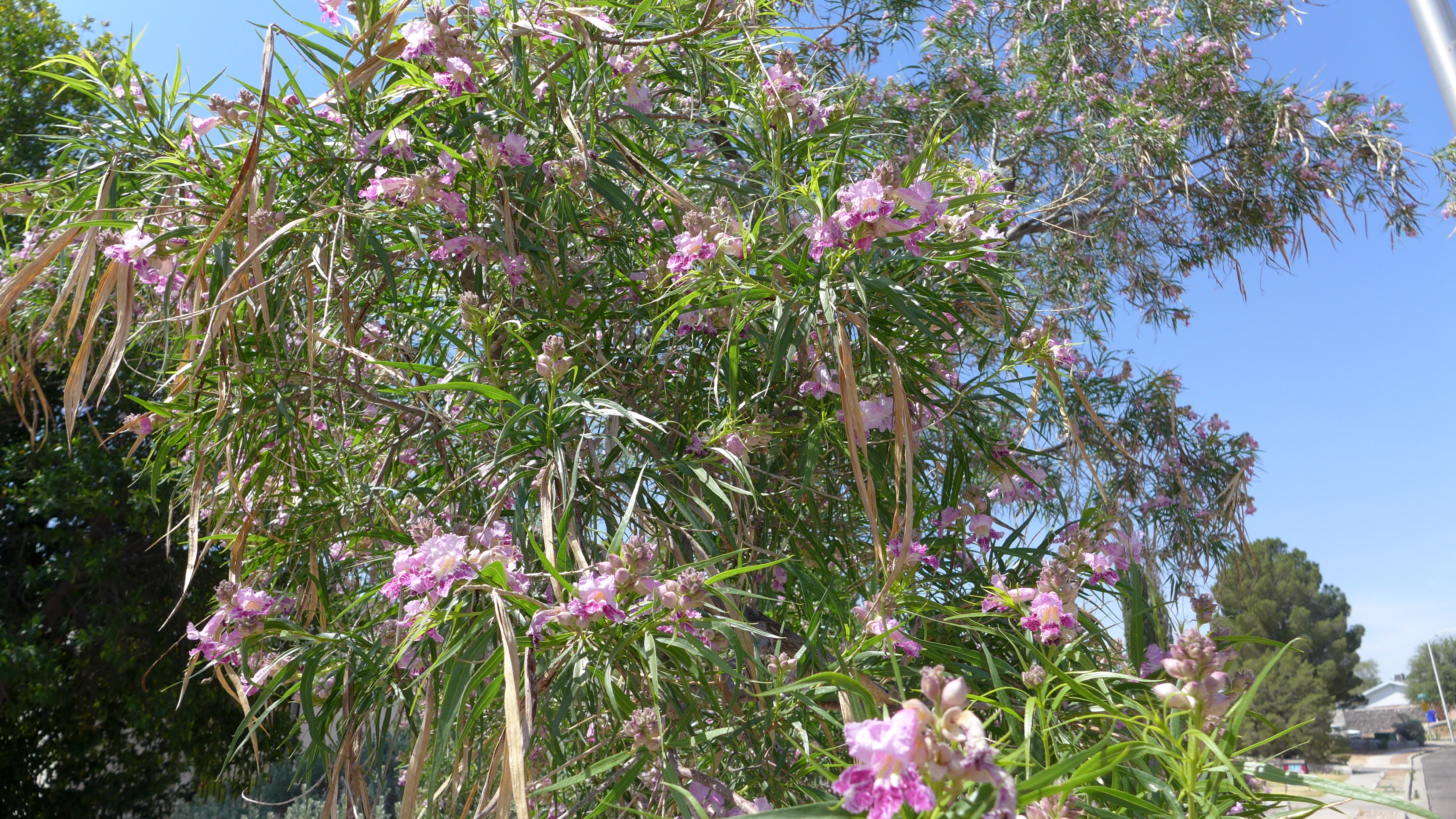 I have two small desert willow plants in my yard. They’ve only put out one or two flowers so far this year – one last year. So I admire the mature trees in my neighbors’ yards. On this one, you can see many blossoms, along with last year’s seed pods. I think I have quite a few years to wait for this kind of display.