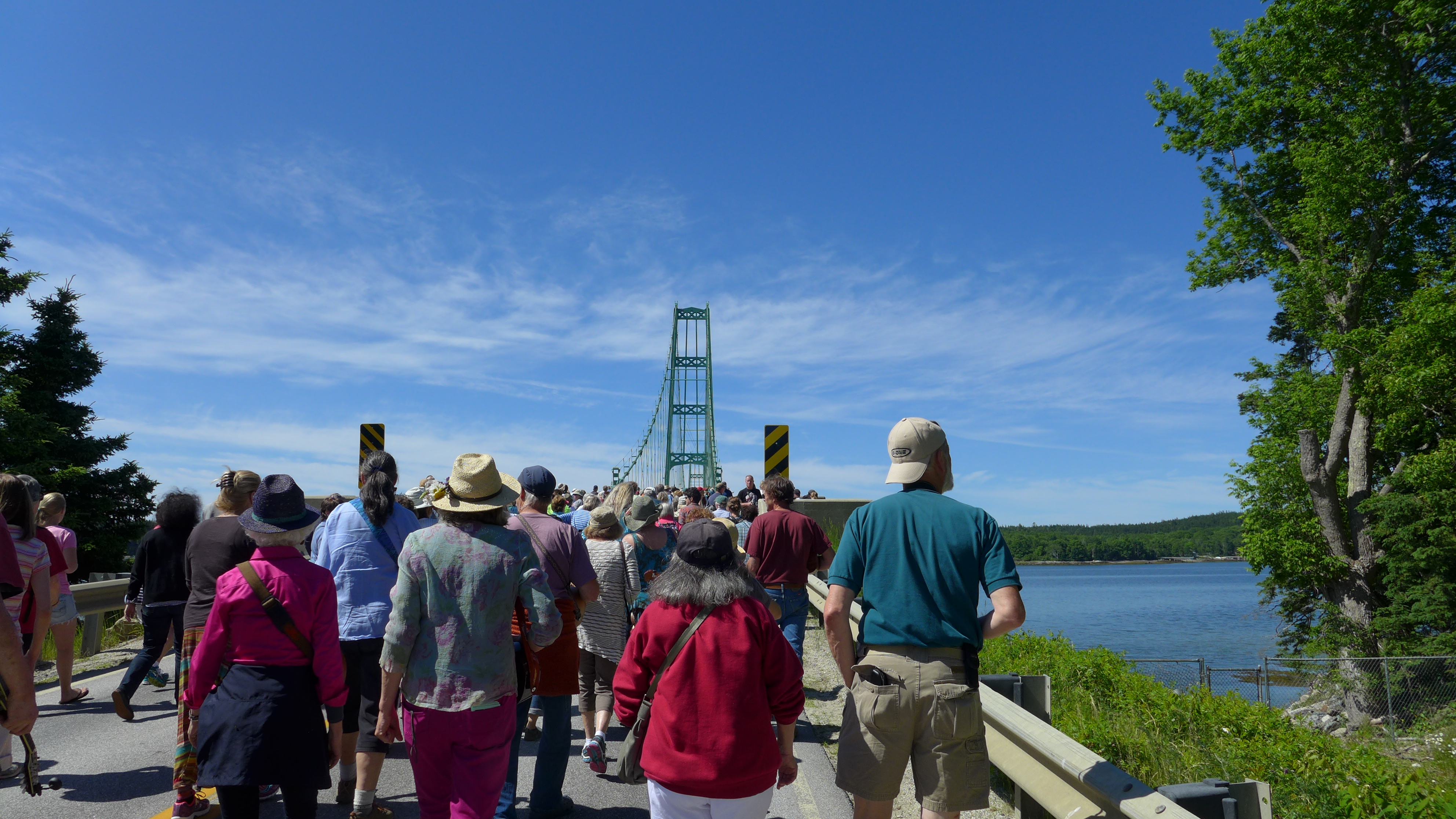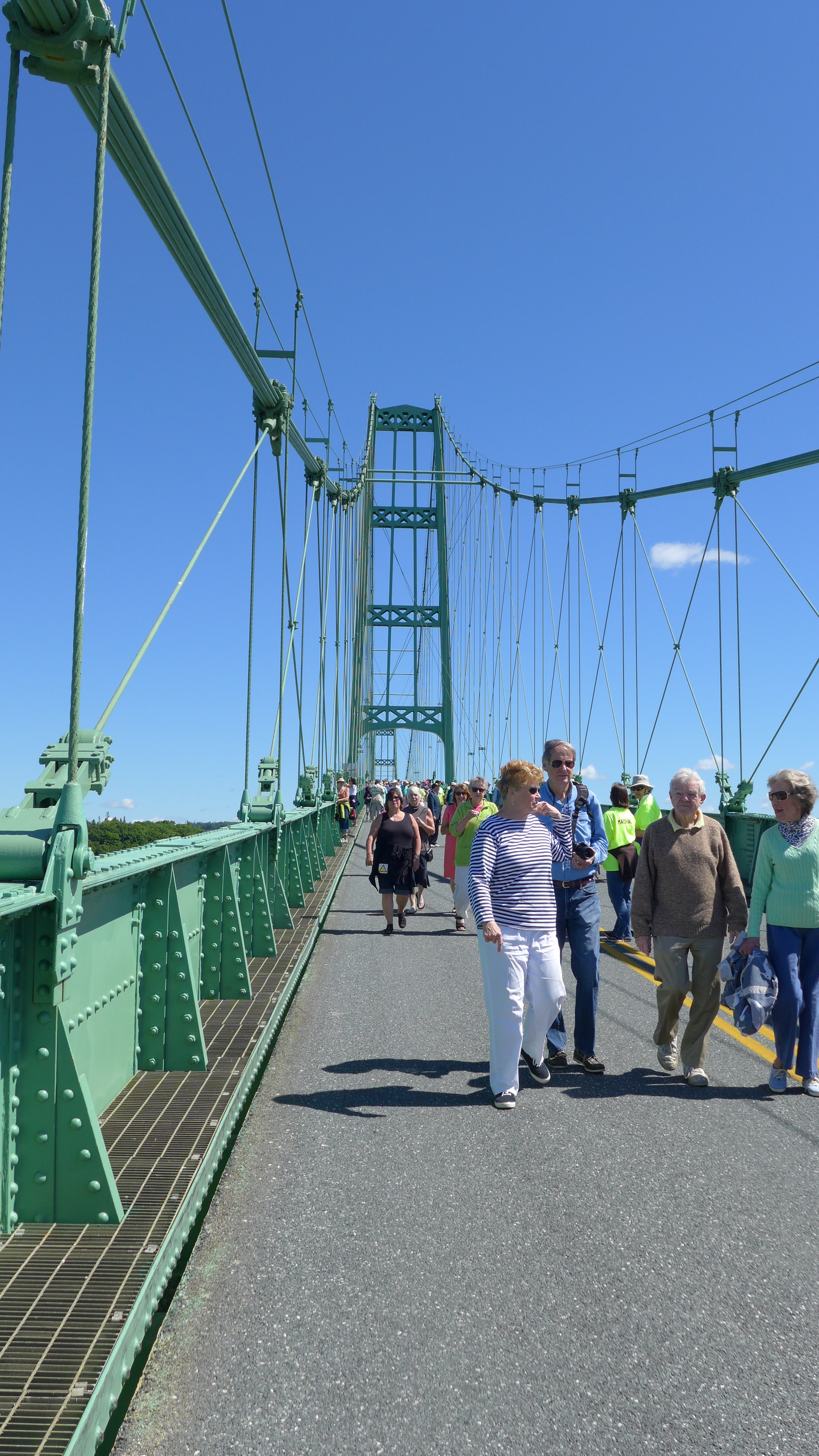 This June day is also a great day for a party. Deer Isle and Sedgwick celebrated the 75th anniversary of our “great green bridge” this morning by closing it for an hour, so people could walk across it. Led by a bagpipe and drums and including a mandolin orchestra, a great crowd walked across, while a sailboat circled below and a small plane flew overhead. A perfect June day.