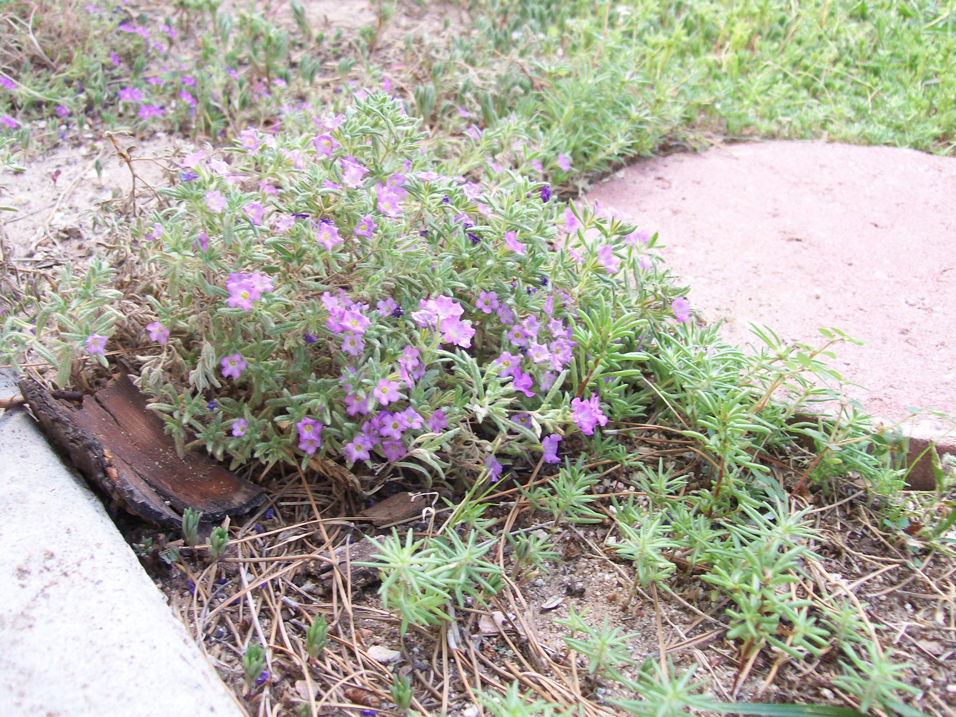 Other weeds I have reclassified as wildflowers. One of these is purple mat (Nama hispidum). When we have a wet winter, which we did not this year, this low plant shows up across the desert where I walk. In my yard, it likes the shady spots where moisture lasts a little longer. I had to go out early to get a picture of it in the sun. And even so, you can hardly make out the purple flowers.